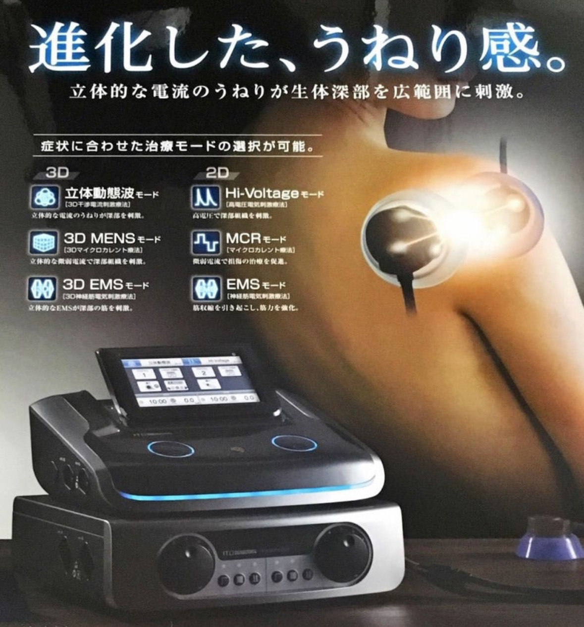 6点の電極から電流が3次元的に干渉して流れることで、手技療法では届かない身体の深い部分の筋肉や関節、神経にもアプローチが可能です。また搬送周波数をスウィープさせることで表層部〜深層部まで部位や症状に合わせて治療が行え、長期の安静や患部の固定をすることなく早期回復を目指せます。